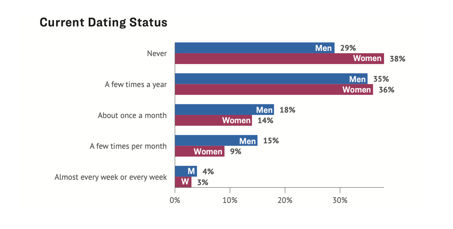 26% of young adult women are “active daters” meaning they date 1x a month or more, while 36% of young adult men are “active daters”