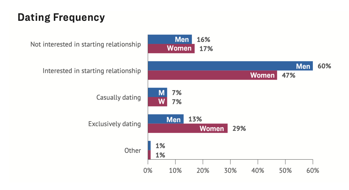 74% of young adult women said they “had not dated or dated only a few times in the last year”, the same was true for 64% of young adult men