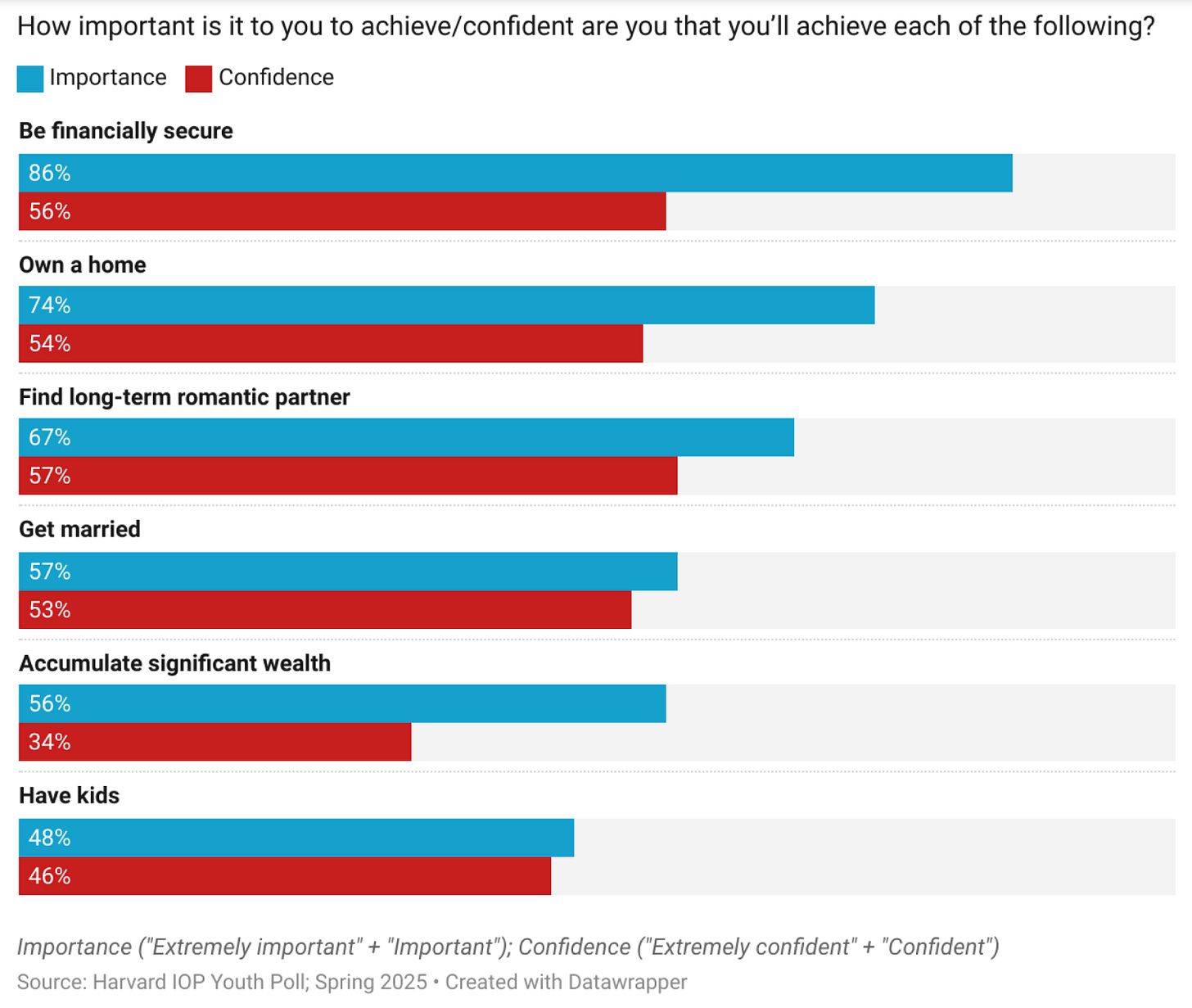 According to this spring’s Harvard IOP youth poll, only 57% of young adults ages 18-29 are confident they will find a long-term romantic partner. Meanwhile, only 57% of young adults want to get married, and just 48% want to have kids.