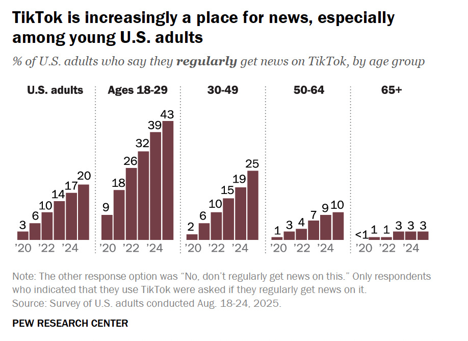 The numbers: According to new data from Pew Research Center, young adults are almost five times more likely to get their news from TikTok today than they were five years ago.