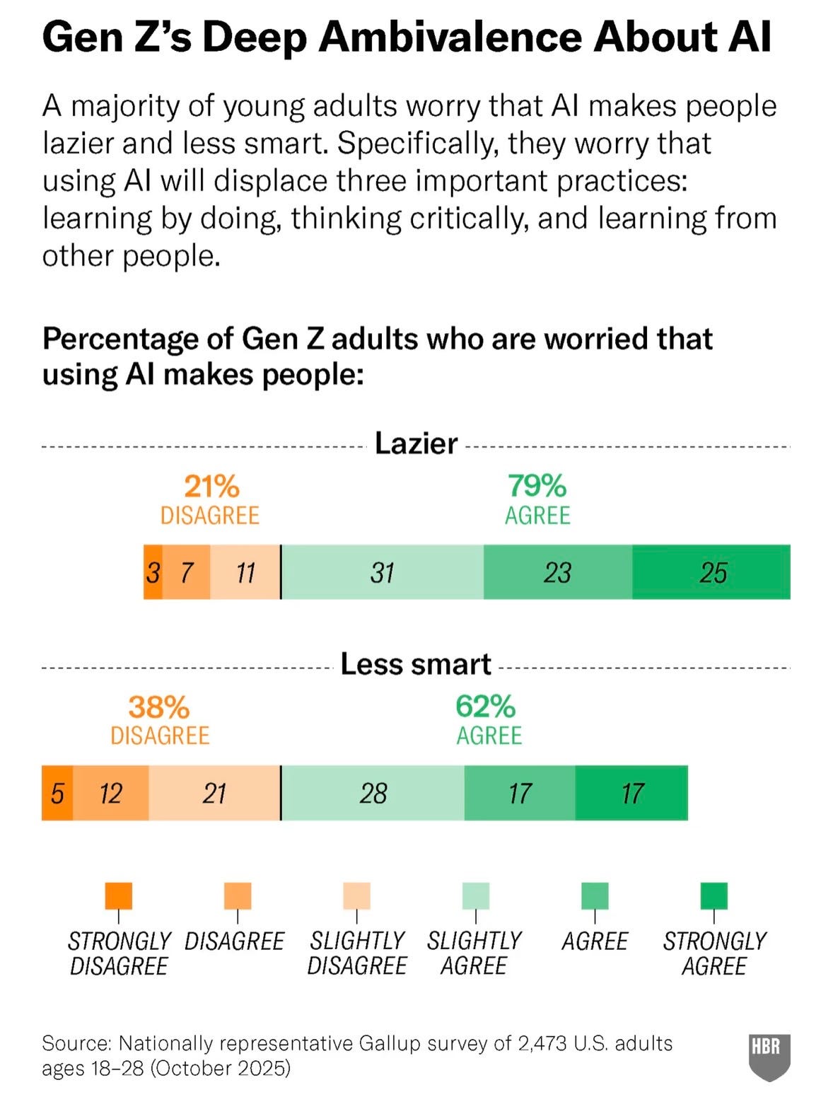 Almost as many Gen Z adults are using AI as say it makes people lazier —> so their relationship to AI contradicts how they feel about it