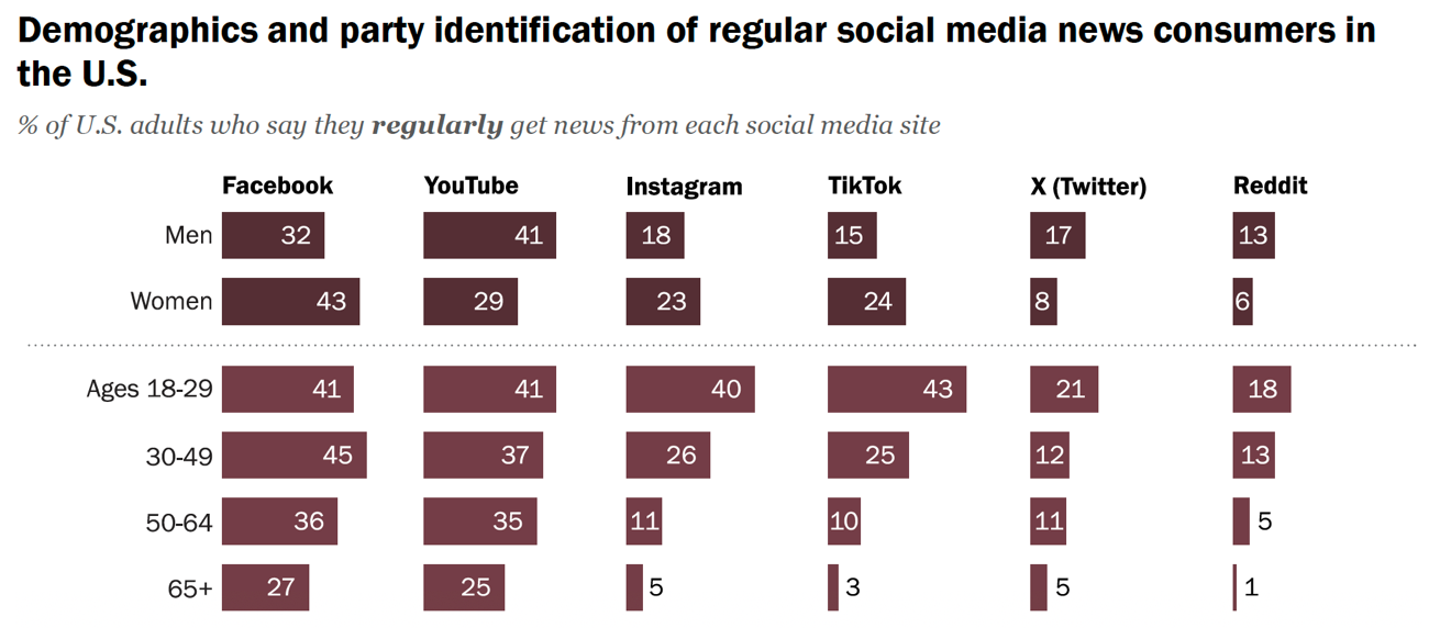 On Tuesday, I wrote about how Gen Z’s use of TikTok for news has grown 5x since 2020. Beyond TikTok, Pew Research Center data shows that young adults ages 18-29 are the most likely demo to get their news on YouTube, Instagram, X, and Reddit — far surpassing 30-49-year-olds on Instagram and X especially.