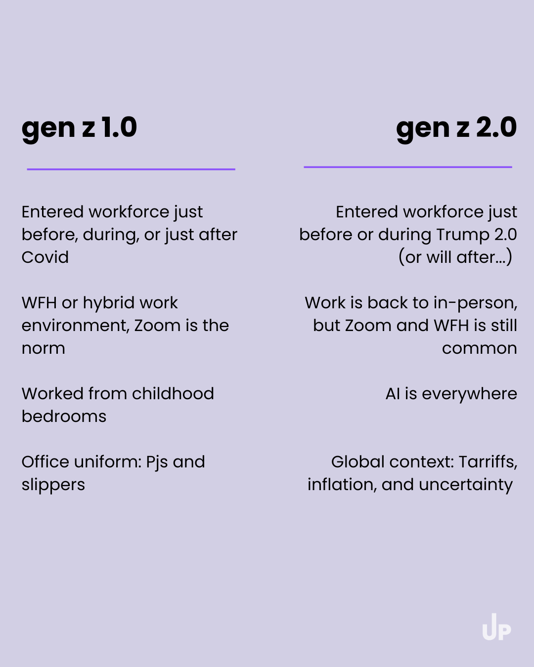 Has that all compounded for Gen Z? The oldest Gen Zers in Gen Z 1.0 were the ones who graduated college just before, during, or just after the pandemic. We faced our fair share of trauma and a bizarre entry to the real world and workforce – working out of our childhood bedrooms in our pajamas.
