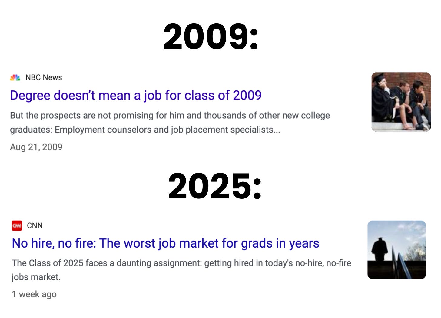 Feedback from recent college graduates featured in my Class of 2025 report earlier this week sounds eerily reminiscent to millennials who graduated in 2009 or 2010 – after the start of the Great Recession.