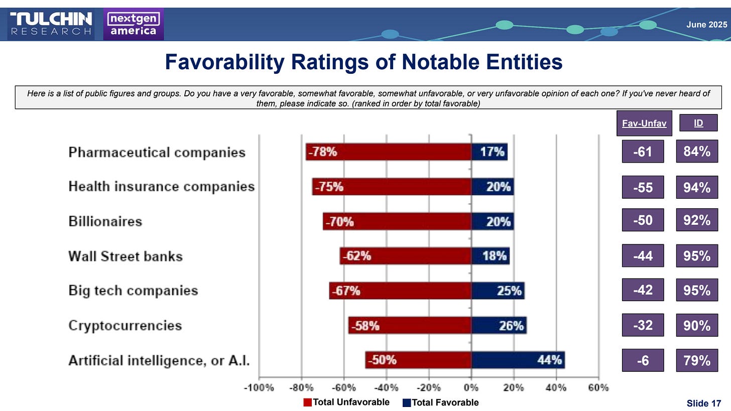 Populist messaging resonates. The poll found deep-seated animosity toward “corporate power and billionaire control.” And despite a recent boom in new tech, there’s even skepticism toward crypto and AI.