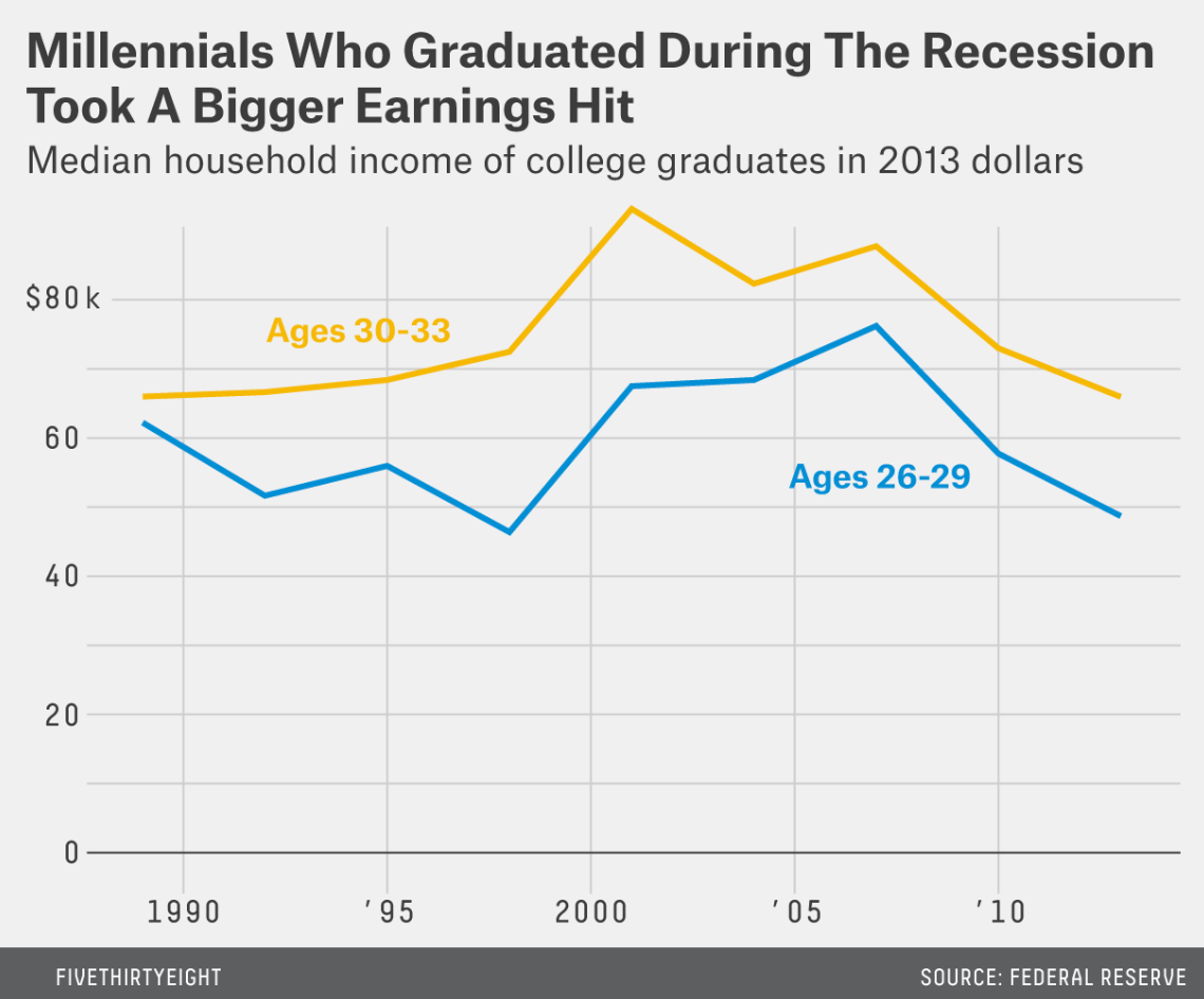 According to a FiveThirtyEight analysis of Federal Reserve data from 2015, millennials started their careers earning less money than the generation before them. The median household income declined, with “recession” millennials hit the hardest because, having graduated into economic strife, they never got an opportunity to kickstart their life in the way grads a few years older had.