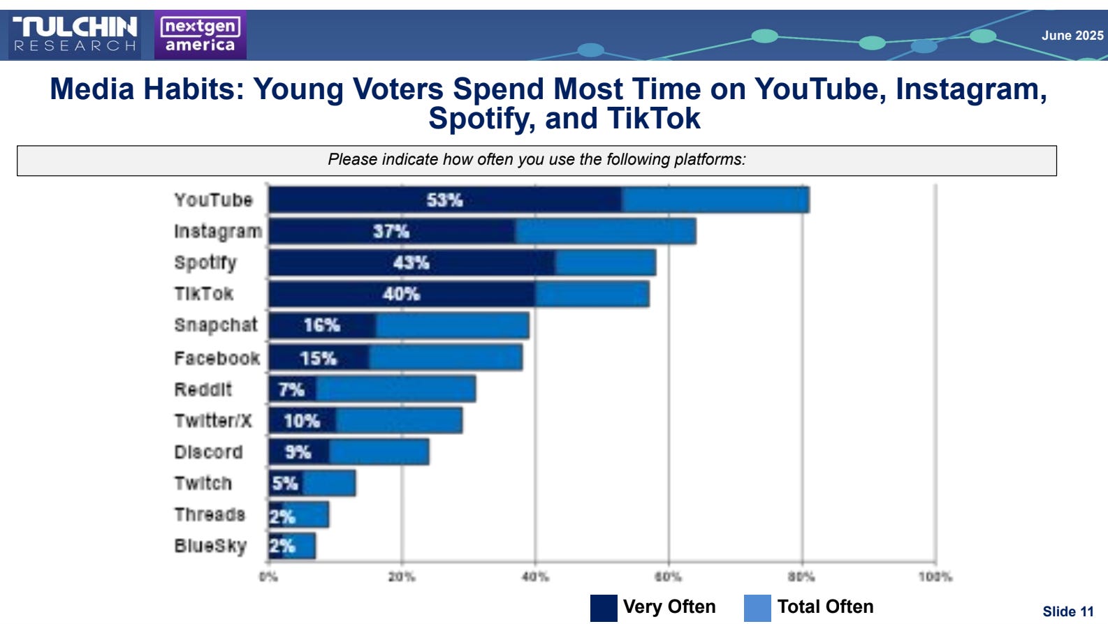It’s not just TikTok. Despite the trope that all young people get their news on TikTok, this poll found that YouTube is actually the top media platform for young people, followed by Instagram and Spotify. And yes – as one of the top places young people get their podcasts, Spotify is a media platform.