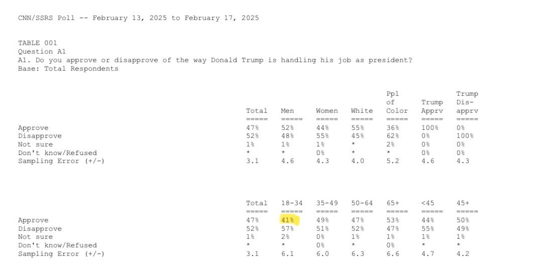 Young people like Trump more than ever before…The youth culture shift with Trump 2.0 continues in early approval rating data. There’s been a 9-point jump in his approval rating with those 18-34 from Feb 2017 to Feb 2025, per CNN polls from then and now.